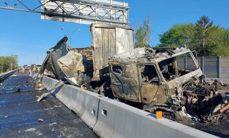 ولم تُسجل إصابات، لكن حركة المرور باتجاه الشرق مغلقة عند المخرج، فيما تُظهر الصور من الموقع أن الشاحنة تعرضت لأضرار جسيمة نتيجة الحريق.