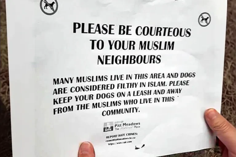 هلا كندا – انتشرت خلال الأيام الأخيرة صورة أثارت ضجة واسعة على المنصات الرقمية، قيل إنها التُقطت في شوارع كندا وتُظهر ورقة تحمل شعار بلدية بيت ميدوز الواقعة قرب فانكوفر، تتضمن نصًا يدعو السكان إلى إبقاء كلابهم بعيدة احترامًا لجيرانهم المسلمين باعتبار الكلاب “نجسة في الإسلام”.