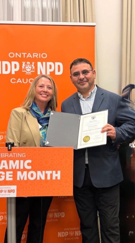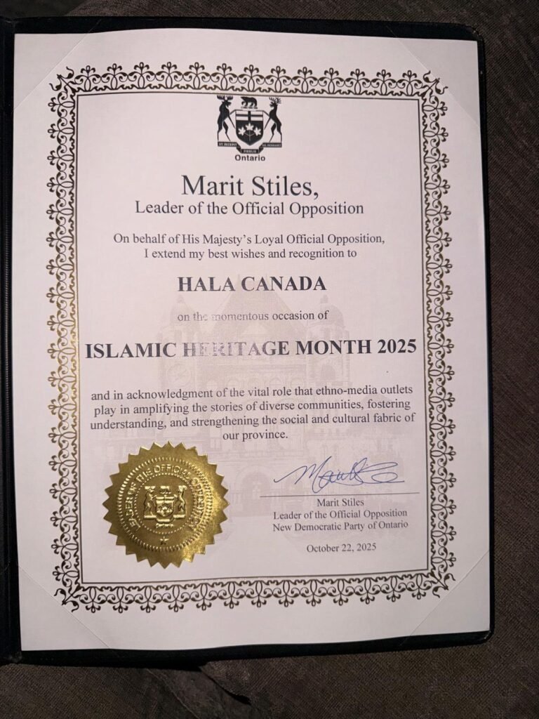 وخلال الفعالية، قامت رئيسة حزب NDP والمعارضة الرسمية في أونتاريو، السيدة Marit Stiles، بتكريم شبكة هلا كندا الإعلامية تقديراً لدورها الريادي في دعم المجتمع العربي والإسلامي في كندا، وما تقدمه من محتوى إعلامي مؤثر يعزز قيم الانفتاح، والتنوع، والتعايش الإيجابي بين مختلف الثقافات.
