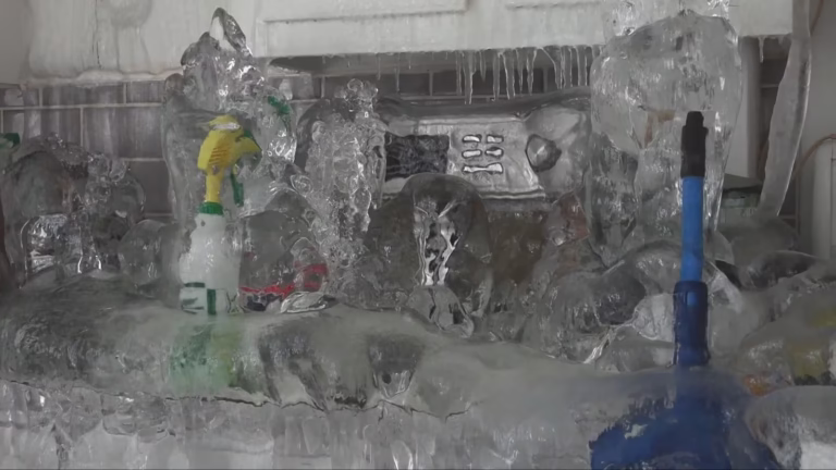 وأفادت التقارير المحلية بأن الطقس القارس أدى إلى تجمد الأنابيب وانفجارها، ما تسبب بتدفق المياه وتحولها إلى جليد داخل الجدران والأسقف في الشقة.