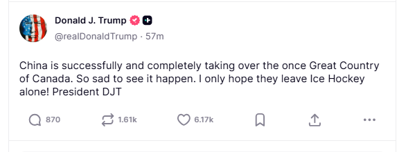 ولم يتوقف ترامب عند هذا الحد، بل اعتبر في تدوينة لاحقة أن الصين “تسيطر بنجاح وكامل على كندا التي كانت يوماً دولة عظيمة”، معرباً عن حزنه لرؤية ذلك يحدث. وفي لفتة ساخرة وسط التوتر السياسي، أضاف ترامب: “آمل فقط أن يتركوا هوكي الجليد وشأنه!”.