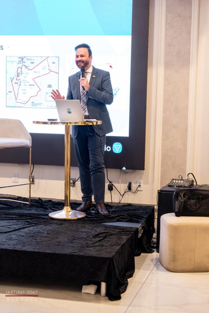 كما شهد الحفل عرضاً تقديمياً هاماً قدمه السيد إياد قدسي، من وزارة التطوير الاقتصادي والتجارة بمقاطعة أونتاريو، استعرض فيه آليات الدعم التي توفرها المقاطعة للشركات الأردنية الراغبة في التوسع والنمو.