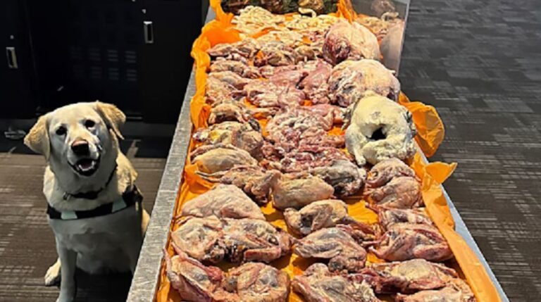 وقالت الوكالة إن كلب الكشف المدرب “دارلا” أشار إلى أمتعة أحد المسافرين في 8 مارس. وبعد التفتيش عُثر على لحوم نيئة من البط والحمام والدجاج والأرنب بوزن إجمالي بلغ 22.5 كيلوغرامًا.